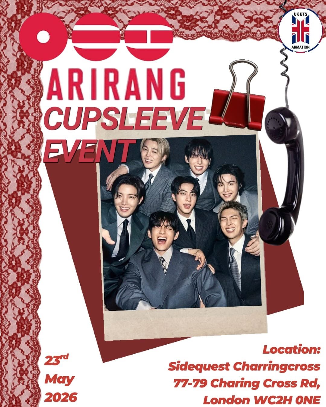 Join UKBTSARMATION and first_korean_cafem for a special BTS-themed celebration centered around the "Arirang" concept. This gathering offers fans a chance to connect and celebrate the group while collecting exclusive, themed memorabilia. The event features a classic aesthetic with designs incorporating red lace and vintage elements.