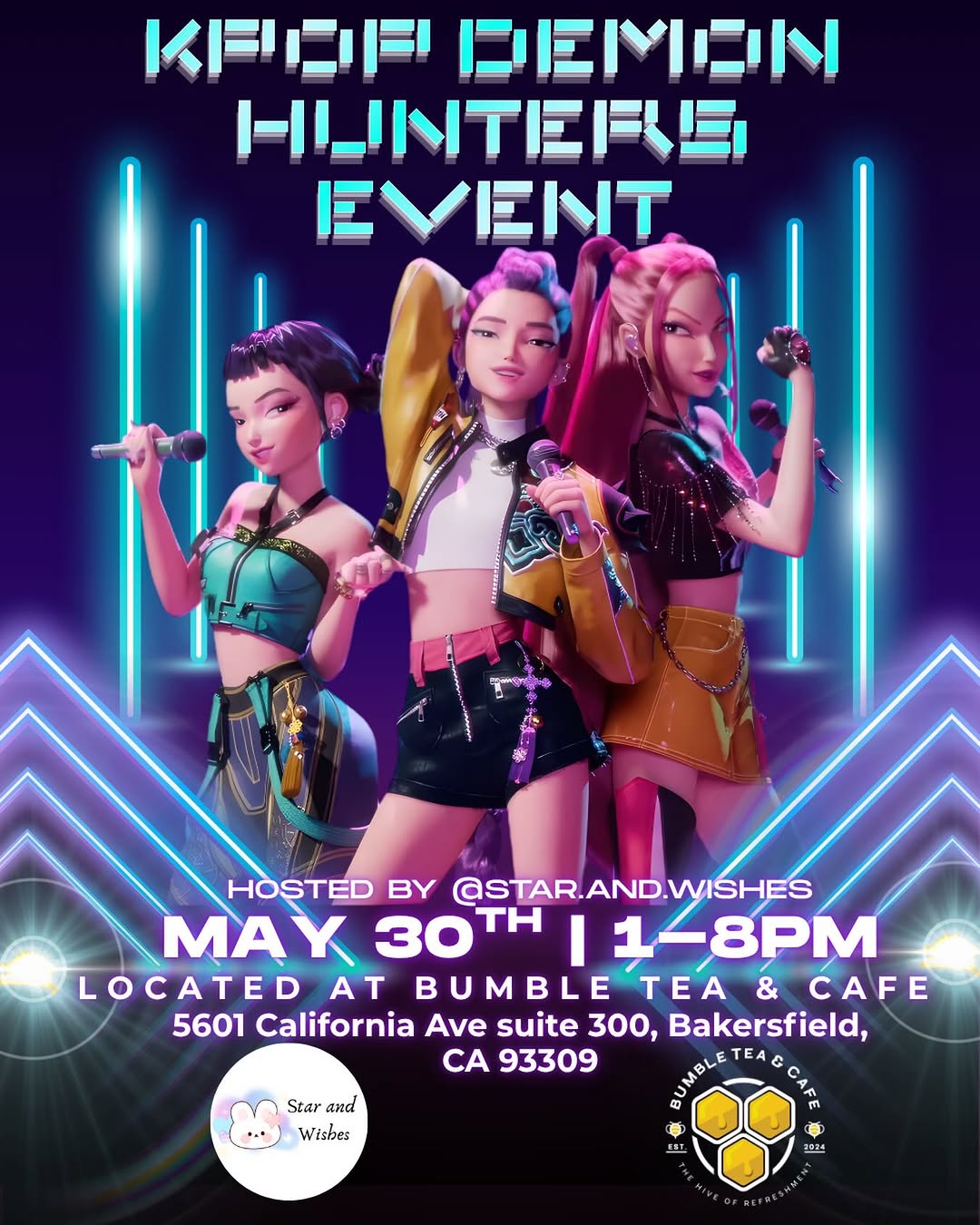 A Kpop Demon Hunters Event hosted in Bakersfield, CA at Bumble Tea & Cafe from 1-8pm! All ages are welcome to come!! Follow us at @star.and.wishes on Instagram for more information on this event!!