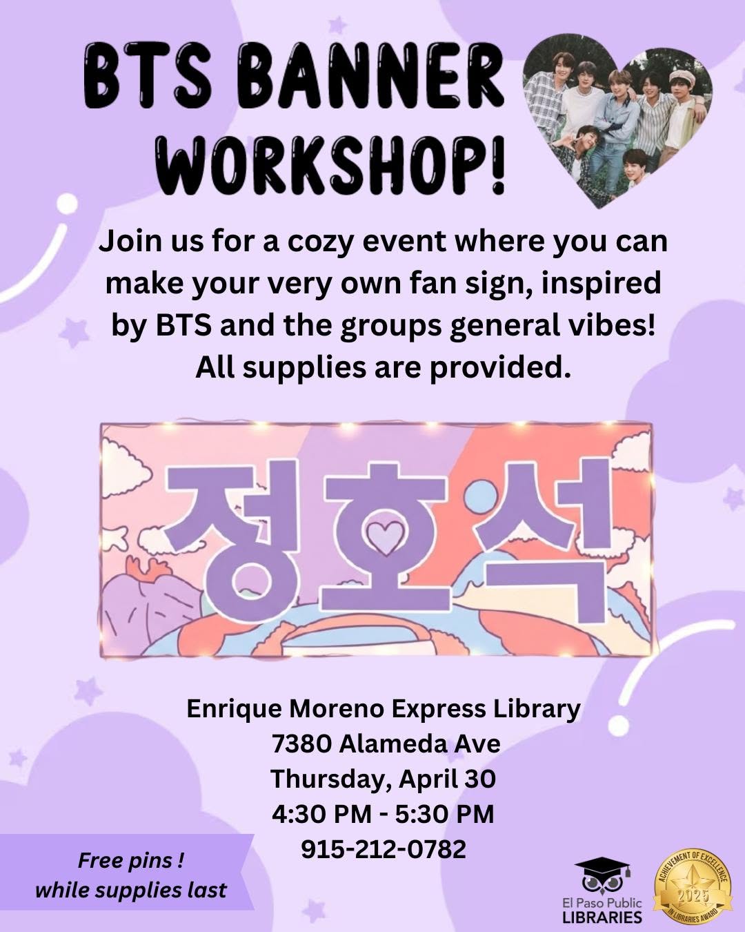 Calling all A.R.M.Y! Get ready to show off your creativity at this cozy arts and crafts event hosted by the El Paso Public Library. This workshop is dedicated to fans who want to express their fandom through art and connect with the community. Participants will be able to craft their very own custom fan signs inspired by the general vibes of BTS and iconic members, such as Jung Hoseok.