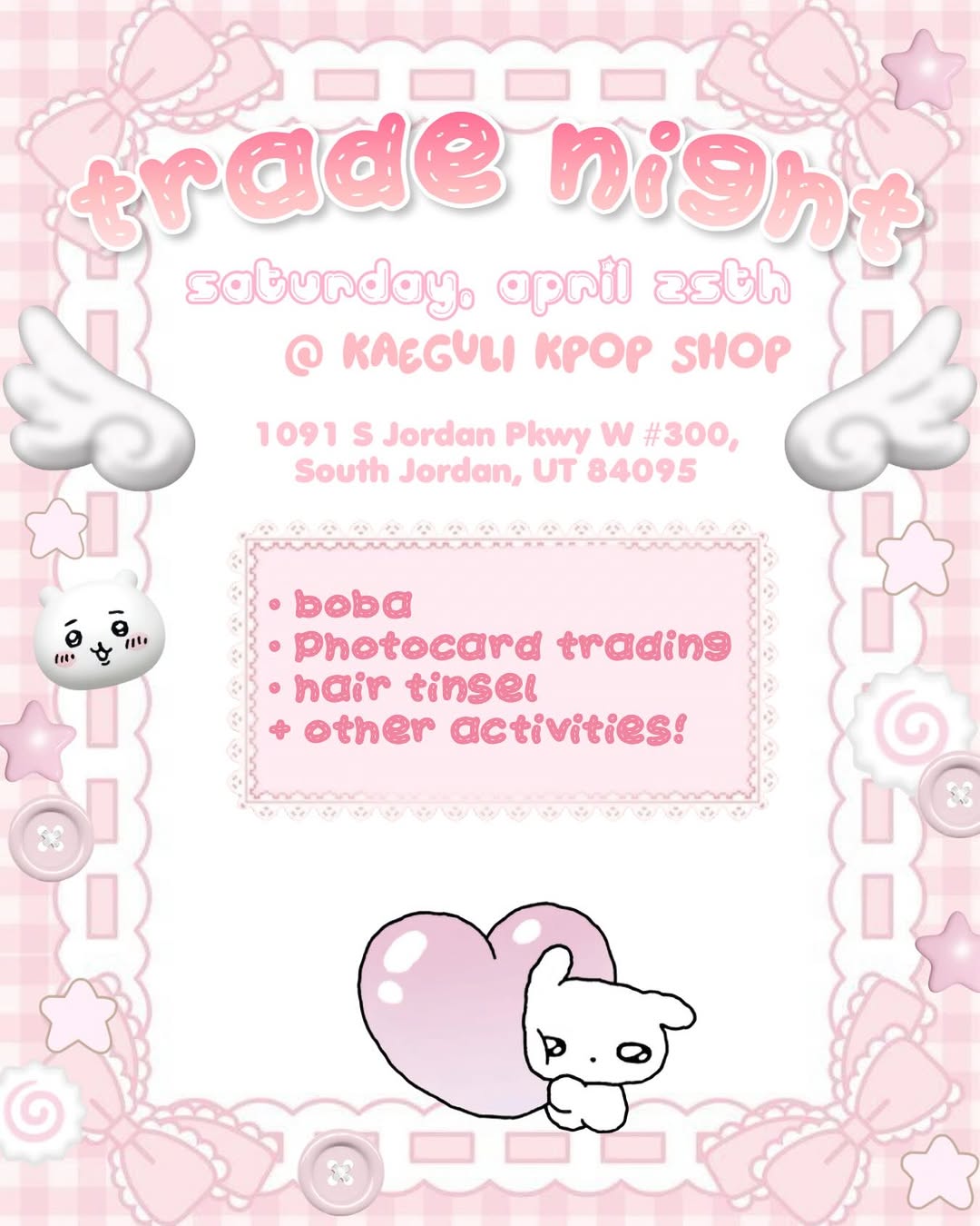 Get your photocard binders ready for an exciting trade night! This event is the perfect opportunity to meet fellow collectors and find those missing pieces for your collection. Trading will take place both inside the shop and in the outdoor areas, so please check the forecast and dress appropriately for the weather to ensure you stay comfortable while trading.
